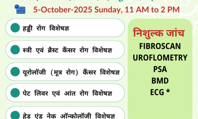 👉 आइए, स्वयं भी लाभ लें और अपने परिवार व मित्रों को भी इस निःशुल्क स्वास्थ्य जांच शिविर में लाएं।